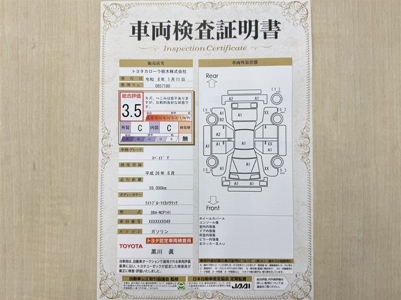 トヨタ自動車が認定した検査員が、厳正に検査した車両検査証明書を発行しています。キズの程度や場所を展開図で分かりやすく表示しているのでおクルマの状態がすぐ分かります。