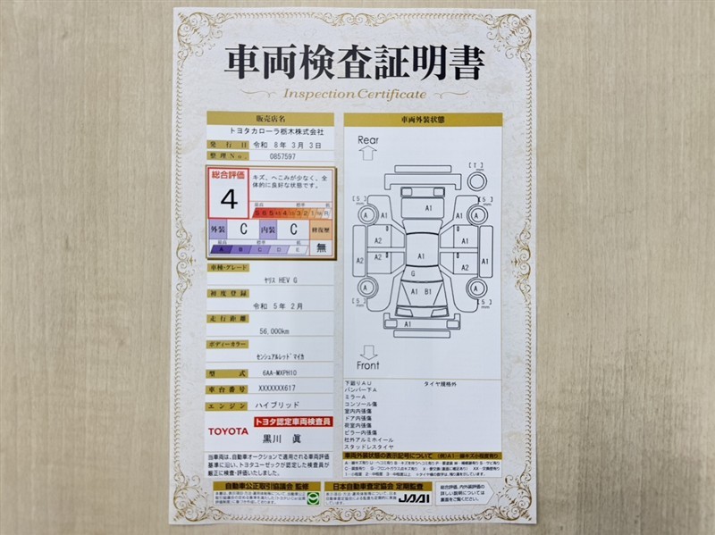トヨタ自動車が認定した検査員が、厳正に検査した車両検査証明書を発行しています。キズの程度や場所を展開図で分かりやすく表示しているのでおクルマの状態がすぐ分かります。