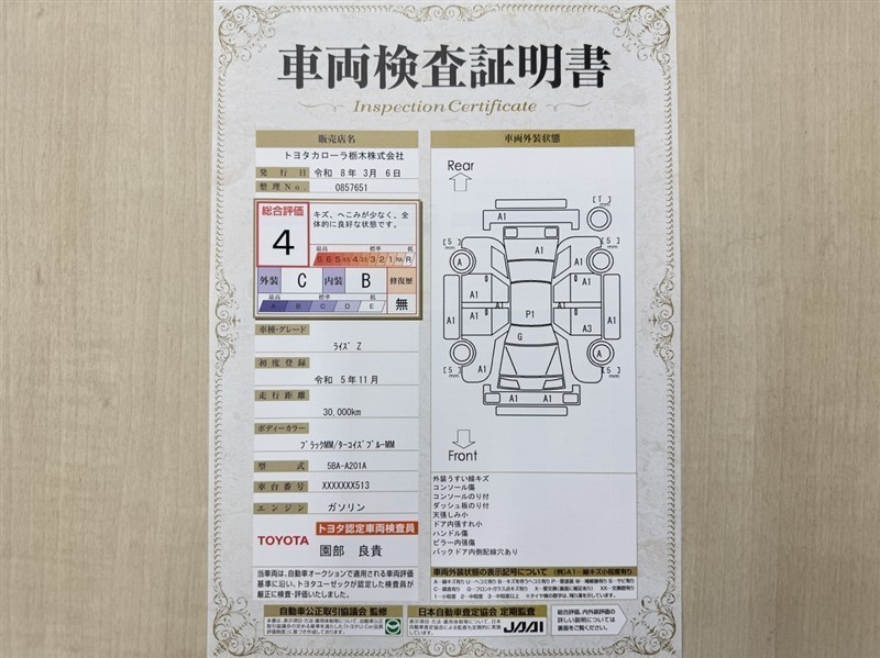 トヨタ自動車が認定した検査員が、厳正に検査した車両検査証明書を発行しています。キズの程度や場所を展開図で分かりやすく表示しているのでおクルマの状態がすぐ分かります。