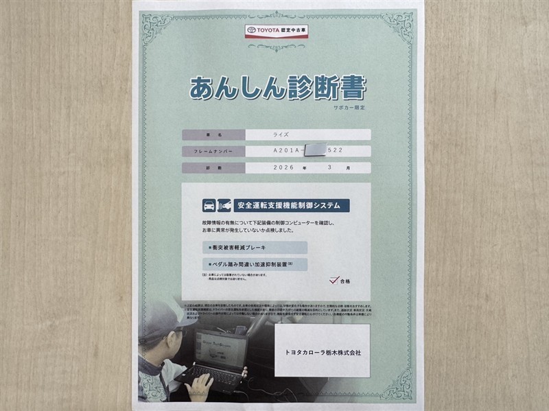 トヨタ自動車が認定した検査員が、厳正に検査した車両検査証明書を発行しています。キズの程度や場所を展開図で分かりやすく表示しているのでおクルマの状態がすぐ分かります。