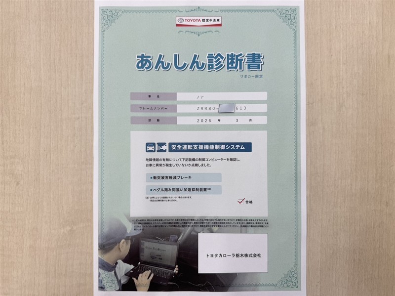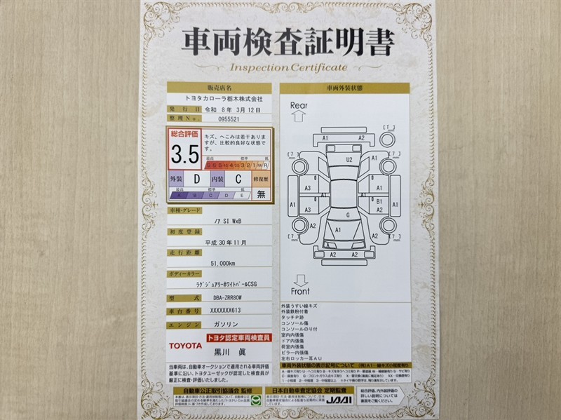 トヨタ自動車が認定した検査員が、厳正に検査した車両検査証明書を発行しています。キズの程度や場所を展開図で分かりやすく表示しているのでおクルマの状態がすぐ分かります。