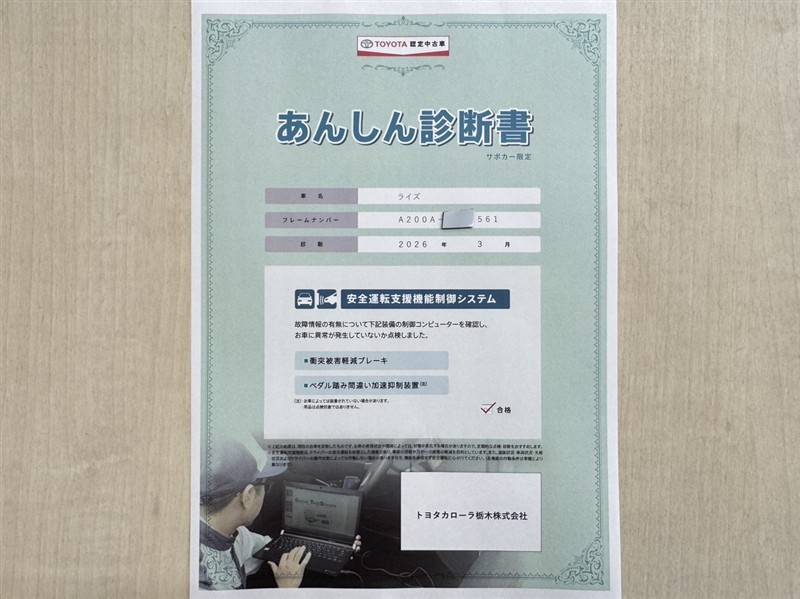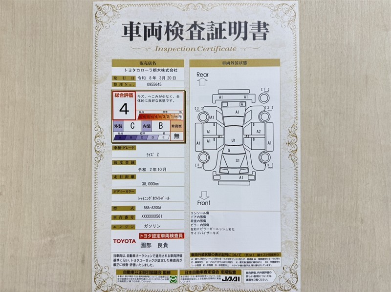 トヨタ自動車が認定した検査員が、厳正に検査した車両検査証明書を発行しています。キズの程度や場所を展開図で分かりやすく表示しているのでおクルマの状態がすぐ分かります。