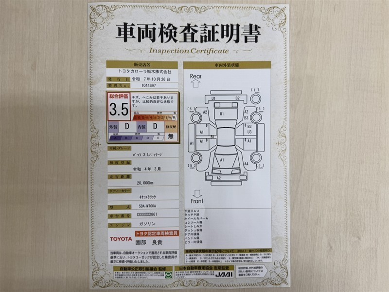 トヨタ自動車が認定した検査員が、厳正に検査した車両検査証明書を発行しています。キズの程度や場所を展開図で分かりやすく表示しているのでおクルマの状態がすぐ分かります。