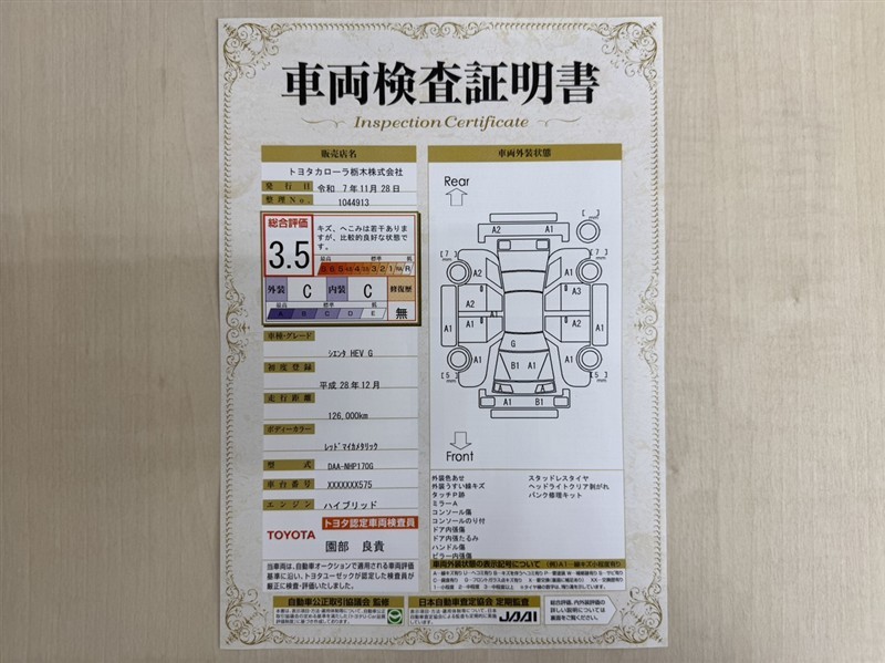 トヨタ自動車が認定した検査員が、厳正に検査した車両検査証明書を発行しています。キズの程度や場所を展開図で分かりやすく表示しているのでおクルマの状態がすぐ分かります。