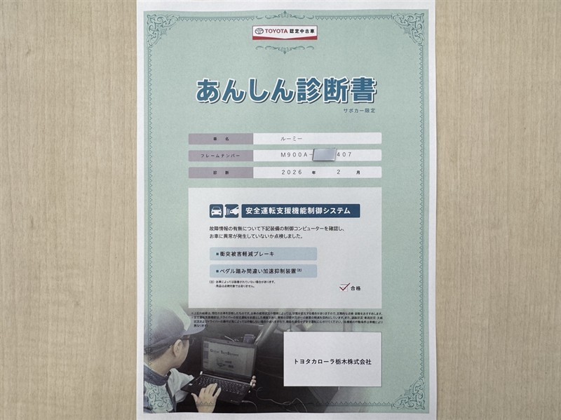 トヨタ自動車が認定した検査員が、厳正に検査した車両検査証明書を発行しています。キズの程度や場所を展開図で分かりやすく表示しているのでおクルマの状態がすぐ分かります。