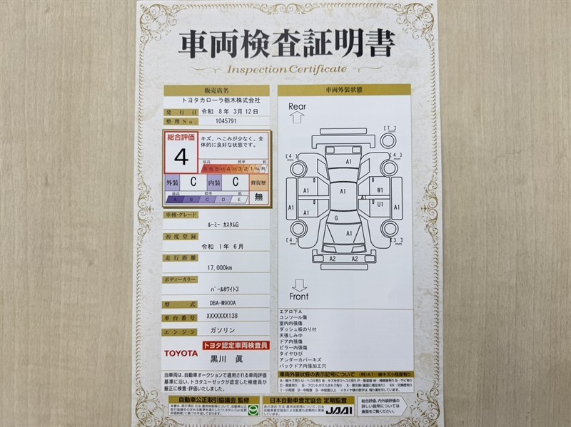 トヨタ自動車が認定した検査員が、厳正に検査した車両検査証明書を発行しています。キズの程度や場所を展開図で分かりやすく表示しているのでおクルマの状態がすぐ分かります。
