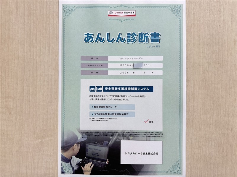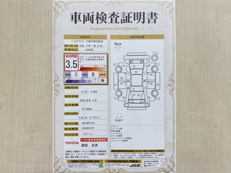 トヨタ自動車が認定した検査員が、厳正に検査した車両検査証明書を発行しています。キズの程度や場所を展開図で分かりやすく表示しているのでおクルマの状態がすぐ分かります。