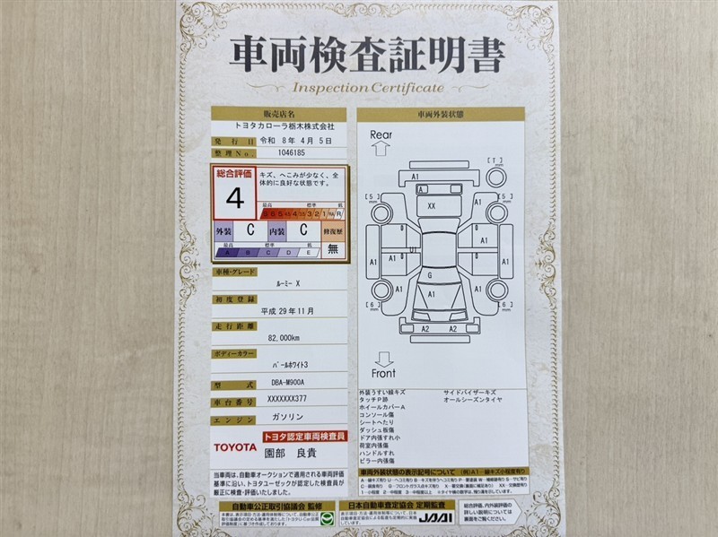 トヨタ自動車が認定した検査員が、厳正に検査した車両検査証明書を発行しています。キズの程度や場所を展開図で分かりやすく表示しているのでおクルマの状態がすぐ分かります。