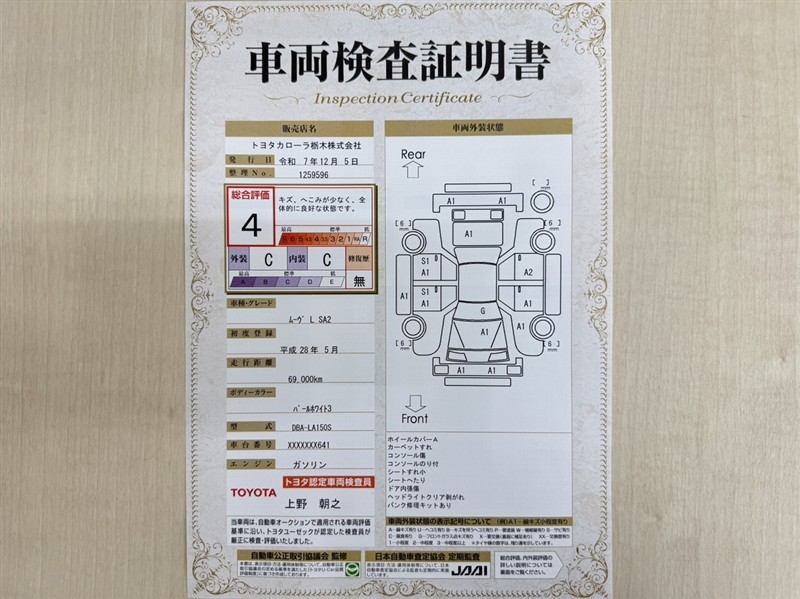 トヨタ自動車が認定した検査員が、厳正に検査した車両検査証明書を発行しています。キズの程度や場所を展開図で分かりやすく表示しているのでおクルマの状態がすぐ分かります。