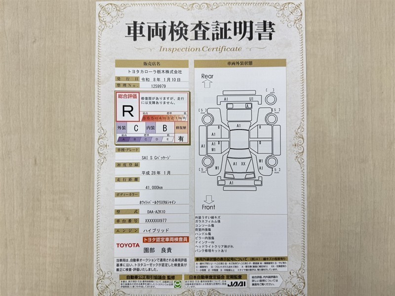 トヨタ自動車が認定した検査員が、厳正に検査した車両検査証明書を発行しています。キズの程度や場所を展開図で分かりやすく表示しているのでおクルマの状態がすぐ分かります。