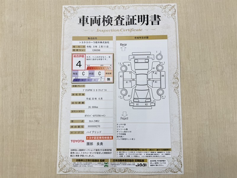 トヨタ自動車が認定した検査員が、厳正に検査した車両検査証明書を発行しています。キズの程度や場所を展開図で分かりやすく表示しているのでおクルマの状態がすぐ分かります。