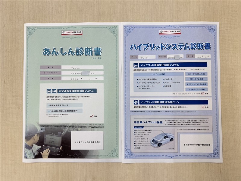 「サポカーあんしん診断」「ハイブリッドシステム診断」実施済み。トヨタ専用診断機器で安心安全にお乗り頂けるよう、綿密に点検しています。