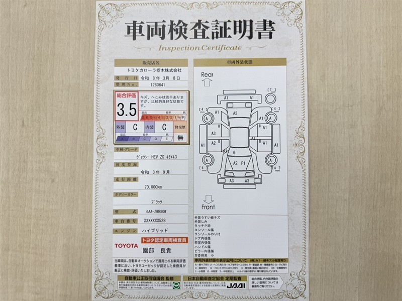 トヨタ自動車が認定した検査員が、厳正に検査した車両検査証明書を発行しています。キズの程度や場所を展開図で分かりやすく表示しているのでおクルマの状態がすぐ分かります。