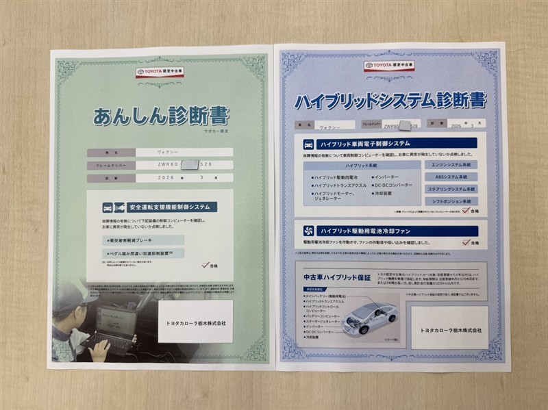 「サポカーあんしん診断」「ハイブリットシステム診断」実施済み。安心安全にお乗り頂けるようトヨタ専用診断機器で綿密にシステムを点検しています。