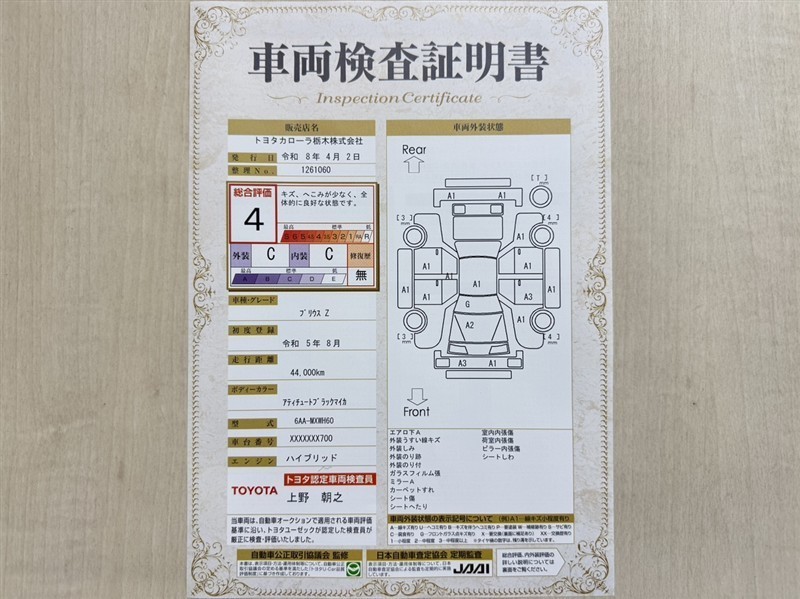 トヨタ自動車が認定した検査員が、厳正に検査した車両検査証明書を発行しています。キズの程度や場所を展開図で分かりやすく表示しているのでおクルマの状態がすぐ分かります。