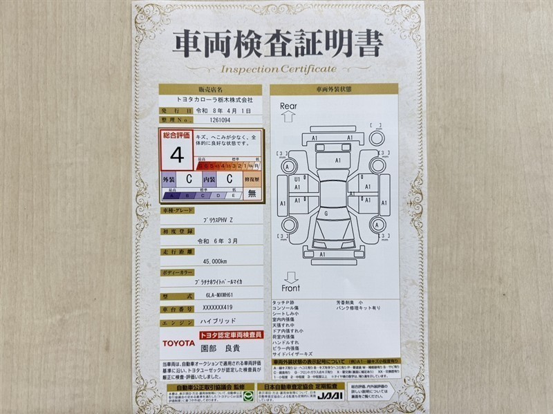 トヨタ自動車が認定した検査員が、厳正に検査した車両検査証明書を発行しています。キズの程度や場所を展開図で分かりやすく表示しているのでおクルマの状態がすぐ分かります。