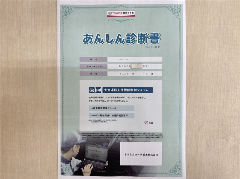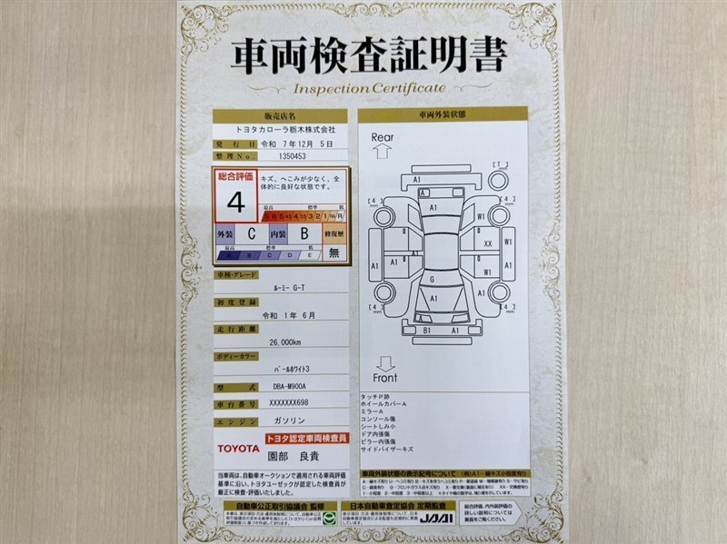 トヨタ自動車が認定した検査員が、厳正に検査した車両検査証明書を発行しています。キズの程度や場所を展開図で分かりやすく表示しているのでおクルマの状態がすぐ分かります。