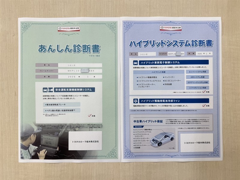 「サポカーあんしん診断」「ハイブリッドシステム診断」実施済み。トヨタ専用診断機器で安心安全にお乗り頂けるよう、綿密に点検しています。