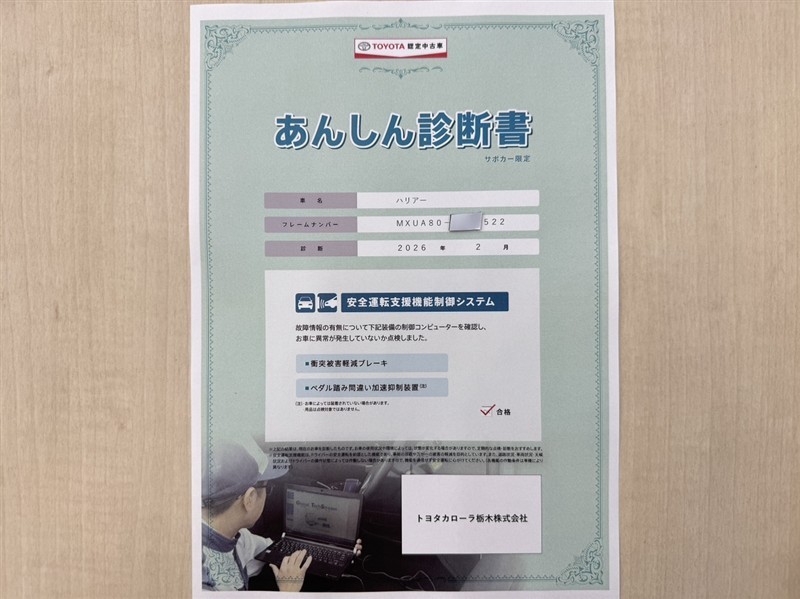 トヨタ自動車が認定した検査員が、厳正に検査した車両検査証明書を発行しています。キズの程度や場所を展開図で分かりやすく表示しているのでおクルマの状態がすぐ分かります。