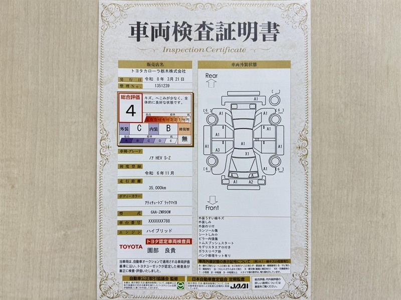 トヨタ自動車が認定した検査員が、厳正に検査した車両検査証明書を発行しています。キズの程度や場所を展開図で分かりやすく表示しているのでおクルマの状態がすぐ分かります。