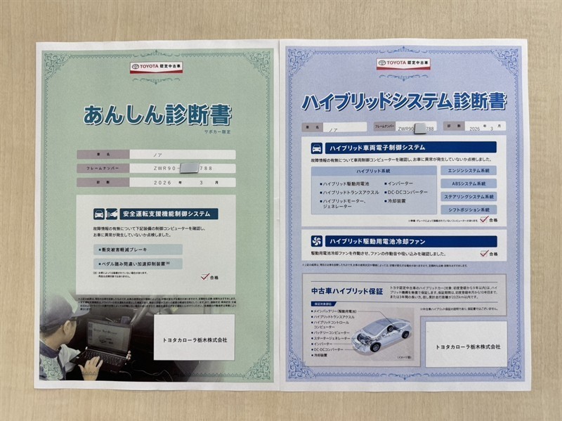 「サポカーあんしん診断」「ハイブリットシステム診断」実施済み。安心安全にお乗り頂けるようトヨタ専用診断機器で綿密にシステムを点検しています。