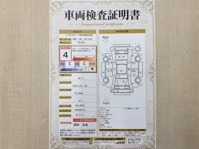 トヨタ自動車が認定した検査員が、厳正に検査した車両検査証明書を発行しています。キズの程度や場所を展開図で分かりやすく表示しているのでおクルマの状態がすぐ分かります。