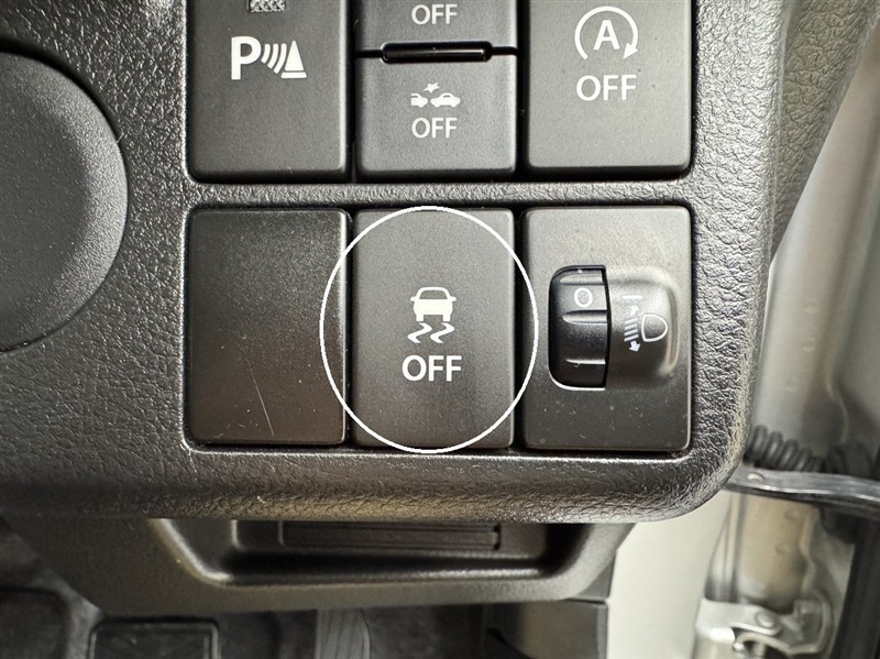 横滑り防止機能のOFFスイッチです。車がぬかるみや雪などタイヤが空転して前にも後ろにも動かない状態になった時OFF状態にして脱出をはかります。