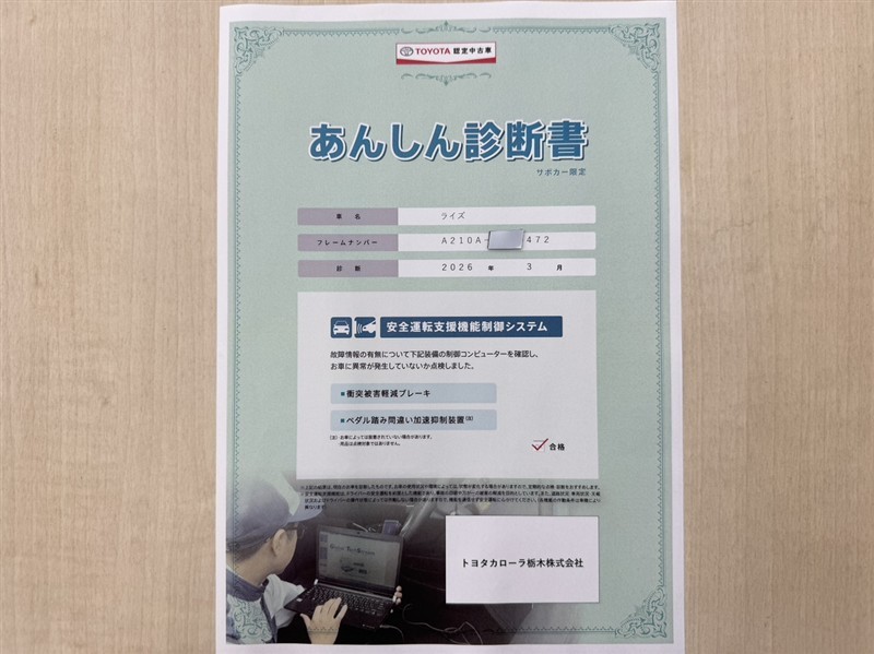 トヨタ自動車が認定した検査員が、厳正に検査した車両検査証明書を発行しています。キズの程度や場所を展開図で分かりやすく表示しているのでおクルマの状態がすぐ分かります。