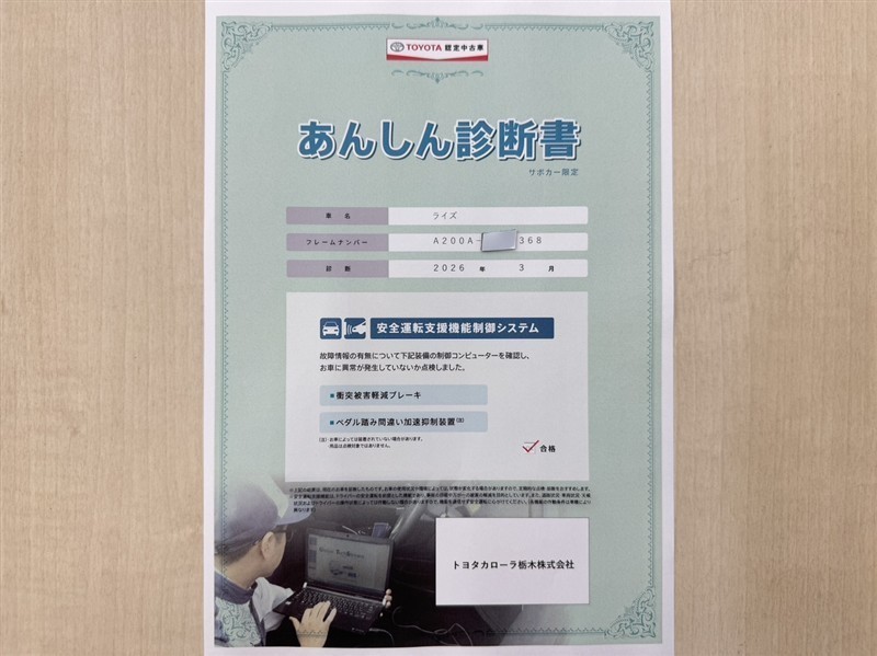 トヨタ自動車が認定した検査員が、厳正に検査した車両検査証明書を発行しています。キズの程度や場所を展開図で分かりやすく表示しているのでおクルマの状態がすぐ分かります。