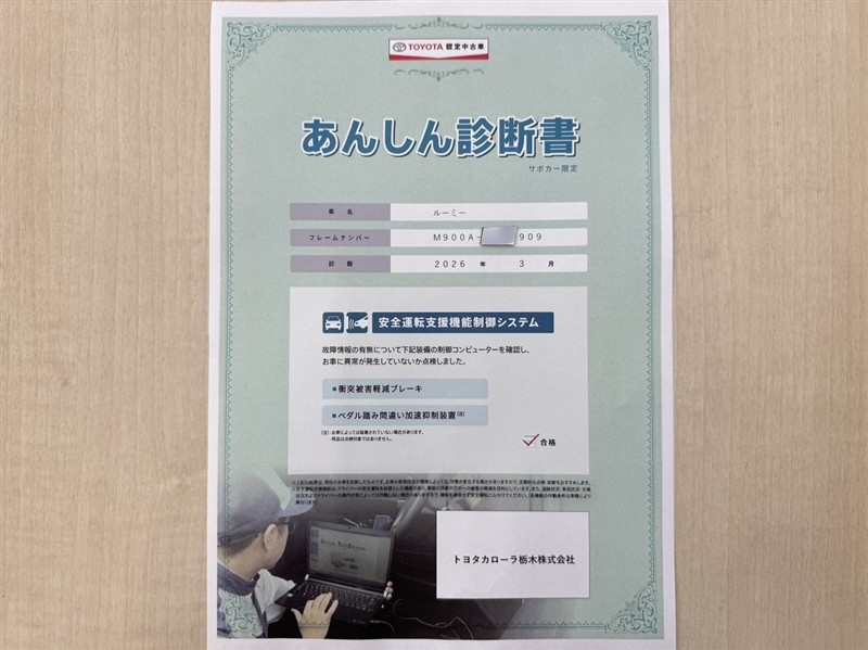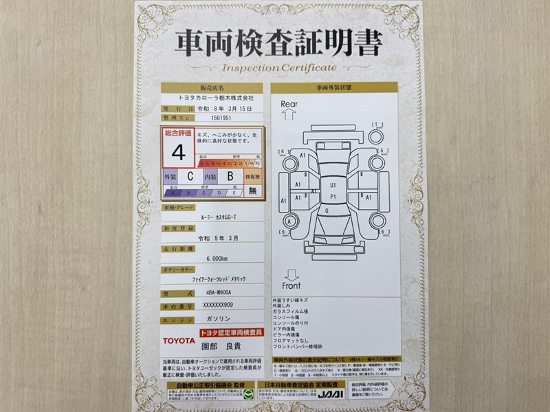 トヨタ自動車が認定した検査員が、厳正に検査した車両検査証明書を発行しています。キズの程度や場所を展開図で分かりやすく表示しているのでおクルマの状態がすぐ分かります。