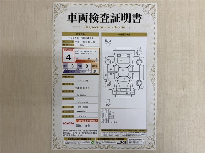 トヨタ自動車が認定した検査員が、厳正に検査した車両検査証明書を発行しています。キズの程度や場所を展開図で分かりやすく表示しているのでおクルマの状態がすぐ分かります。