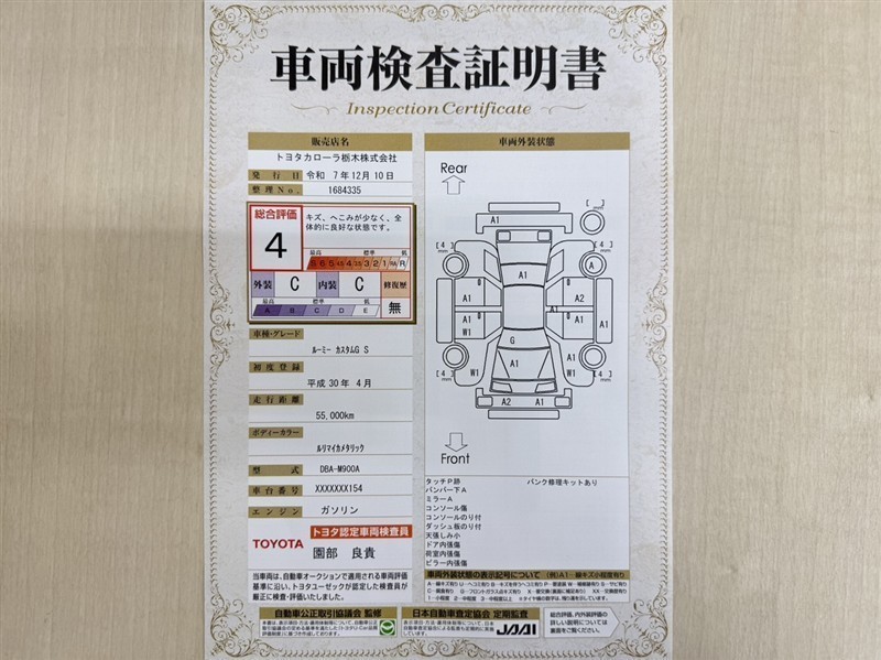 トヨタ自動車が認定した検査員が、厳正に検査した車両検査証明書を発行しています。キズの程度や場所を展開図で分かりやすく表示しているのでおクルマの状態がすぐ分かります。