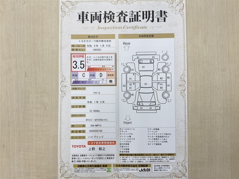 トヨタ自動車が認定した検査員が、厳正に検査した車両検査証明書を発行しています。キズの程度や場所を展開図で分かりやすく表示しているのでおクルマの状態がすぐ分かります。