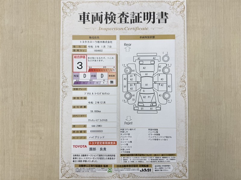 トヨタ自動車が認定した検査員が、厳正に検査した車両検査証明書を発行しています。キズの程度や場所を展開図で分かりやすく表示しているのでおクルマの状態がすぐ分かります。