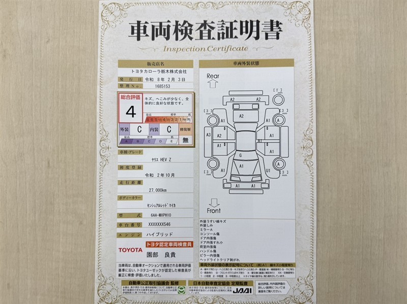トヨタ自動車が認定した検査員が、厳正に検査した車両検査証明書を発行しています。キズの程度や場所を展開図で分かりやすく表示しているのでおクルマの状態がすぐ分かります。