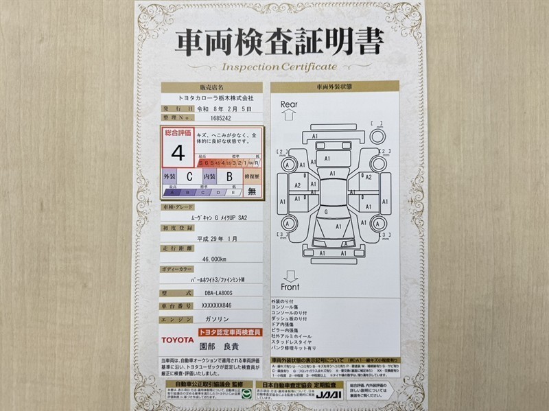 トヨタ自動車が認定した検査員が、厳正に検査した車両検査証明書を発行しています。キズの程度や場所を展開図で分かりやすく表示しているのでおクルマの状態がすぐ分かります。