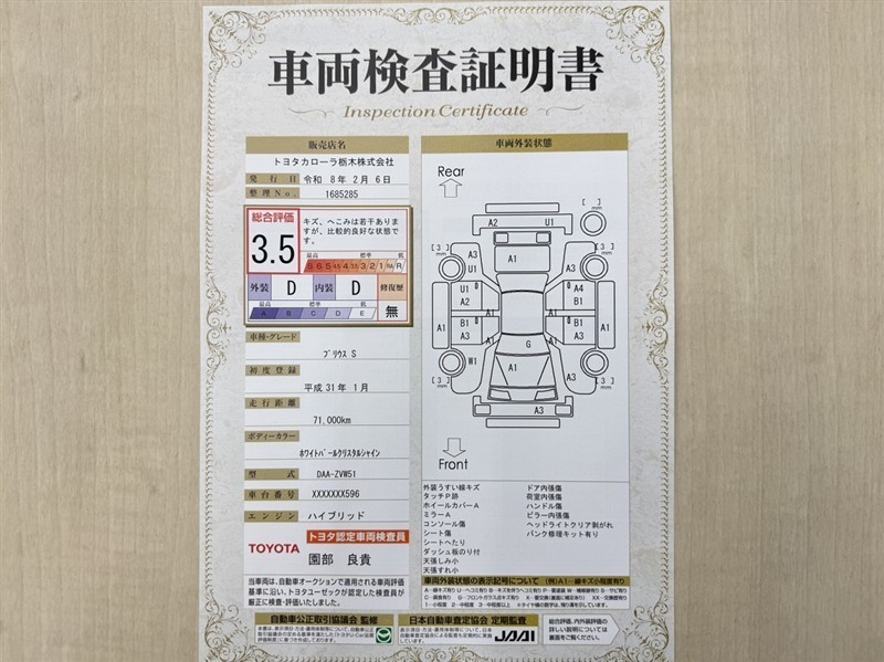 トヨタ自動車が認定した検査員が、厳正に検査した車両検査証明書を発行しています。キズの程度や場所を展開図で分かりやすく表示しているのでおクルマの状態がすぐ分かります。