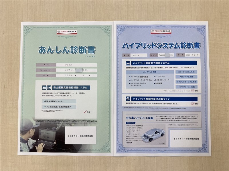 「サポカーあんしん診断」「ハイブリッドシステム診断」実施済み。トヨタ専用診断機器で安心安全にお乗り頂けるよう、綿密に点検しています。