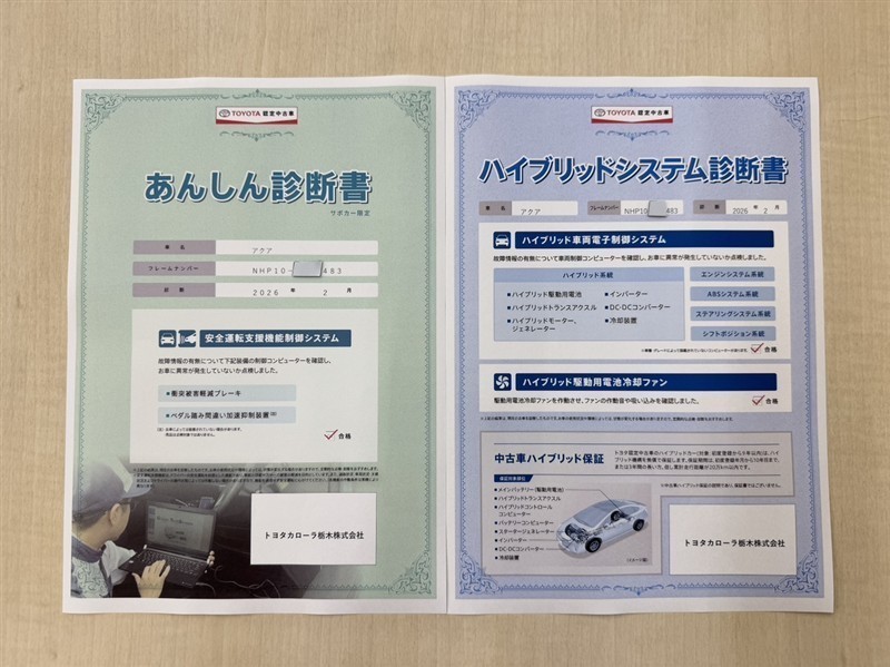 「サポカーあんしん診断」「ハイブリットシステム診断」実施済み。安心安全にお乗り頂けるようトヨタ専用診断機器で綿密にシステムを点検しています。