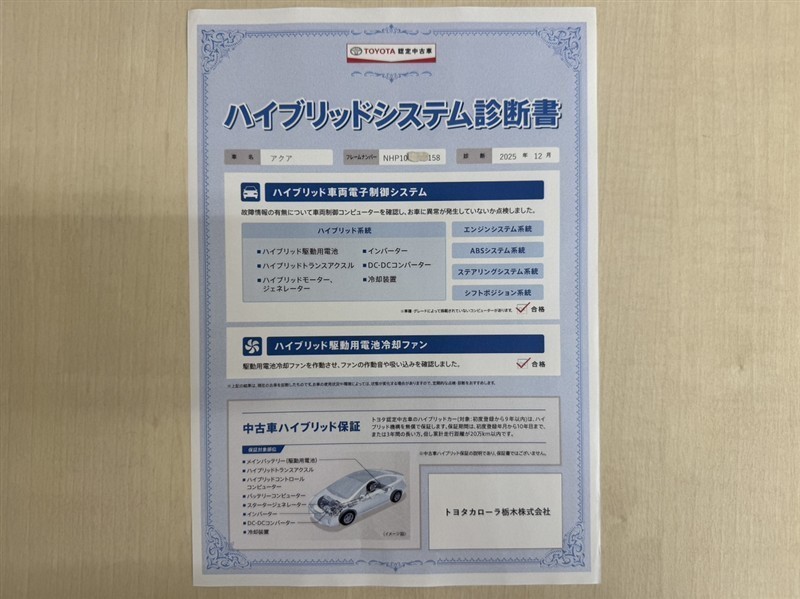 「ハイブリッドシステム診断」実施済み。トヨタ専用診断機器で安心安全にお乗り頂けるよう、綿密に点検しています。