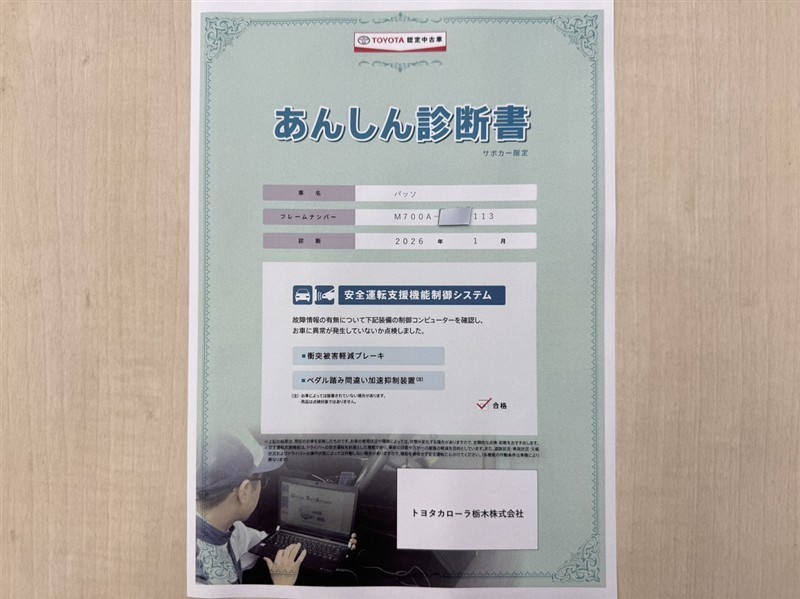 トヨタ自動車が認定した検査員が、厳正に検査した車両検査証明書を発行しています。キズの程度や場所を展開図で分かりやすく表示しているのでおクルマの状態がすぐ分かります。