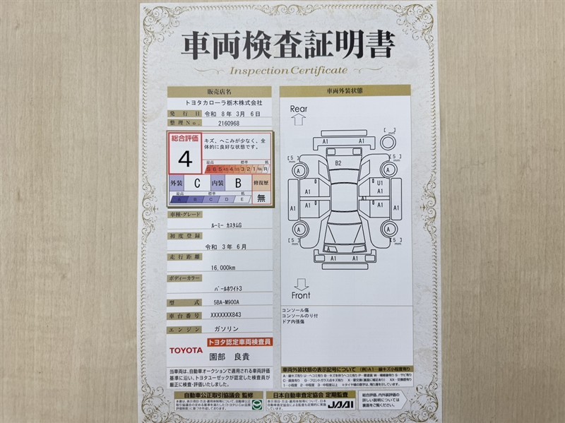 トヨタ自動車が認定した検査員が、厳正に検査した車両検査証明書を発行しています。キズの程度や場所を展開図で分かりやすく表示しているのでおクルマの状態がすぐ分かります。