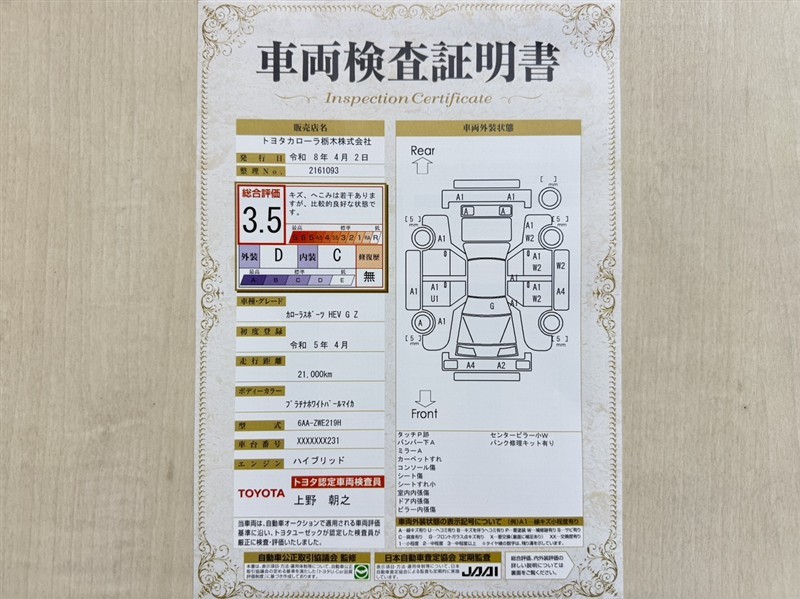 トヨタ自動車が認定した検査員が、厳正に検査した車両検査証明書を発行しています。キズの程度や場所を展開図で分かりやすく表示しているのでおクルマの状態がすぐ分かります。