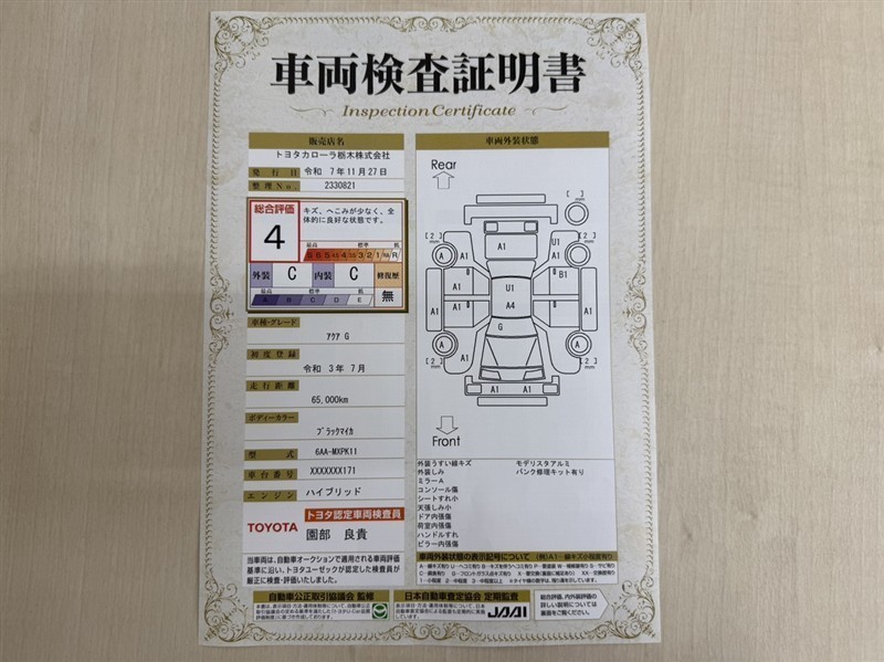 トヨタ自動車が認定した検査員が、厳正に検査した車両検査証明書を発行しています。キズの程度や場所を展開図で分かりやすく表示しているのでおクルマの状態がすぐ分かります。