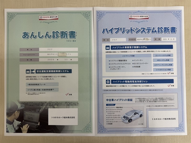 「サポカーあんしん診断」「ハイブリットシステム診断」実施済み。安心安全にお乗り頂けるようトヨタ専用診断機器で綿密にシステムを点検しています。