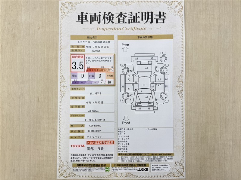 トヨタ自動車が認定した検査員が、厳正に検査した車両検査証明書を発行しています。キズの程度や場所を展開図で分かりやすく表示しているのでおクルマの状態がすぐ分かります。