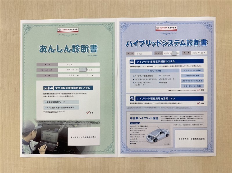 「サポカーあんしん診断」「ハイブリッドシステム診断」実施済み。トヨタ専用診断機器で安心安全にお乗り頂けるよう、綿密に点検しています。