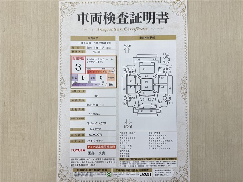 トヨタ自動車が認定した検査員が、厳正に検査した車両検査証明書を発行しています。キズの程度や場所を展開図で分かりやすく表示しているのでおクルマの状態がすぐ分かります。
