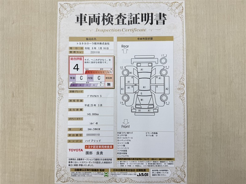 トヨタ自動車が認定した検査員が、厳正に検査した車両検査証明書を発行しています。キズの程度や場所を展開図で分かりやすく表示しているのでおクルマの状態がすぐ分かります。