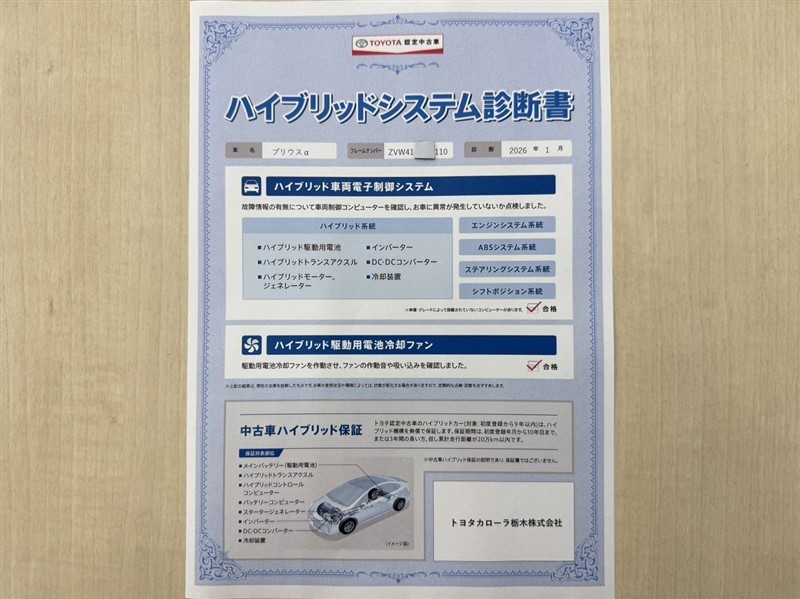 「ハイブリッドシステム診断」実施済み。トヨタ専用診断機器でハイブリッドシステムを綿密に点検しています。